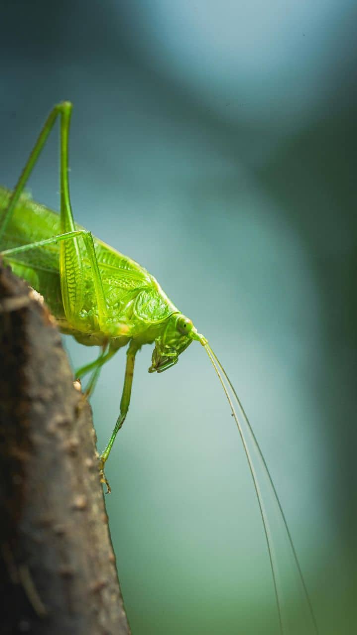 Found in grasslands, meadow katydids have long antennae and green bodies, blending effortlessly among tall grasses.