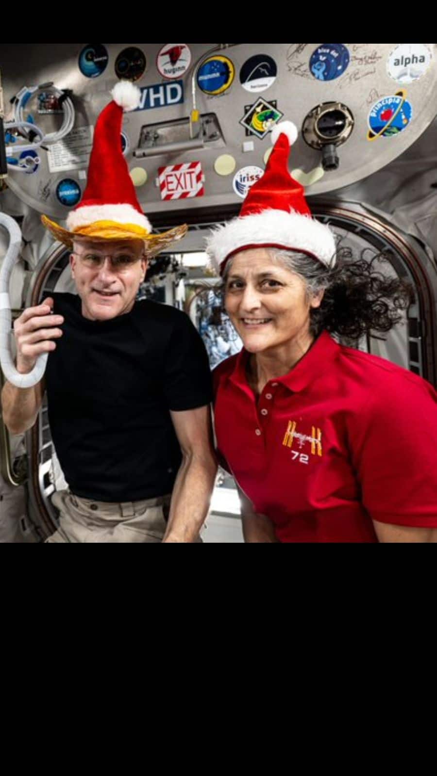 On Dec. 17, 2024, NASA astronauts Don Pettit and Suni Williams enjoy a festive portrait while using a ham radio inside the Space Station’s Columbus module.