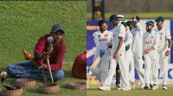 The Sri Lanka-Bangladesh rivalry went a notch higher when a snake charmer was seen at the Galle International Stadium during the Test match, which ended in a draw. This was an unexpected and strange sight at any cricketing event and visuals of it have gone viral on social media. The man was seen enjoying the action while seated peacefully on the ground with two spectacled cobras and a monkey.