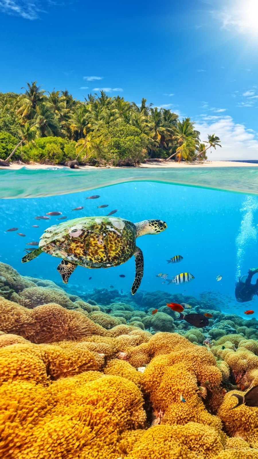 Unique, crystal-clear waters rich with vibrant coral formations, reef sharks, and exotic fish species.