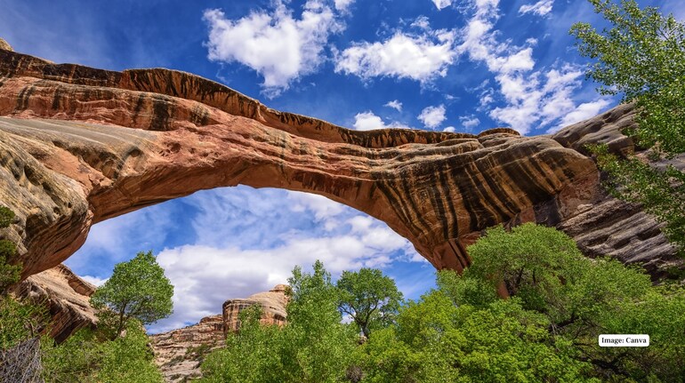 Sipapu Bridge is among the greatest natural stone spans in the world, found in Natural Bridges National Monument. It is a mountain that overlooks a deep canyon, and can be reached via hiking paths, where viewers can see the scenic desert scenery of Utah.