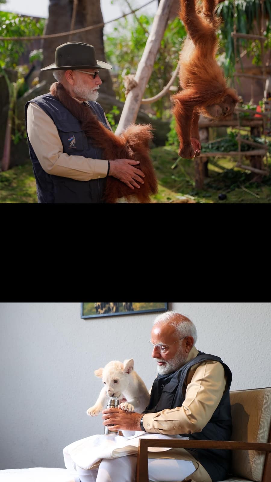 PM Modi watched rescued flamingos flourish in their new habitat. He also hugged and lovingly played with orangutans rescued from overcrowded facilities.