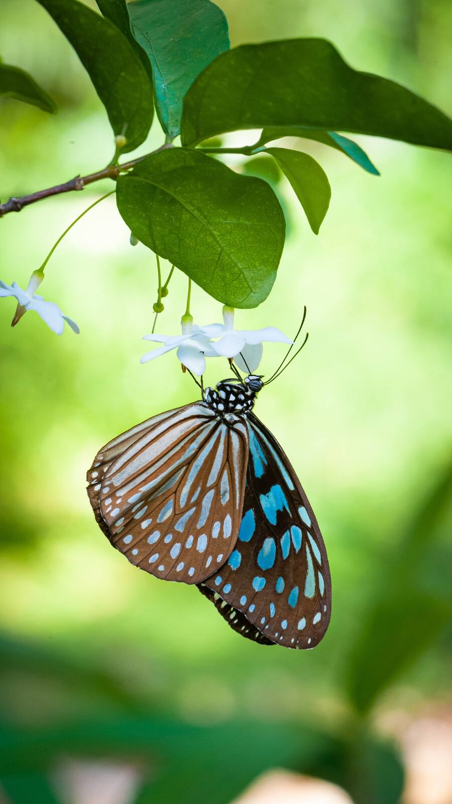 Around this massive banyan tree visitors can find native flora that draws butterflies. The tree’s vast canopy and surrounding greenery make it a unique place to enjoy the beauty of butterflies in nature.