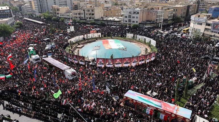 Their coffins were driven into Tehran's Azadi Square adorned with their photos and national flags, as crowds waved flags and some reached out to touch the caskets and throw rose petals onto them. State-run Press TV showed an image of ballistic missiles on display.